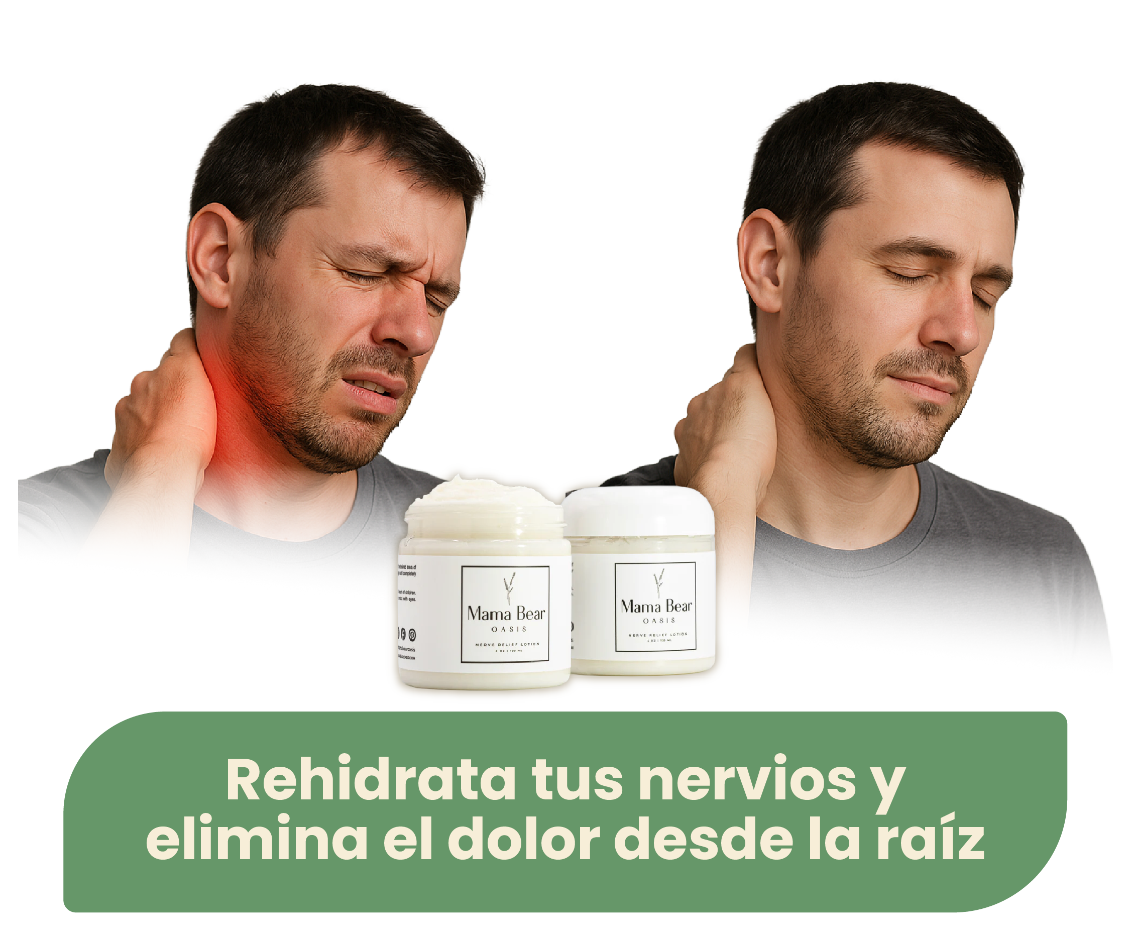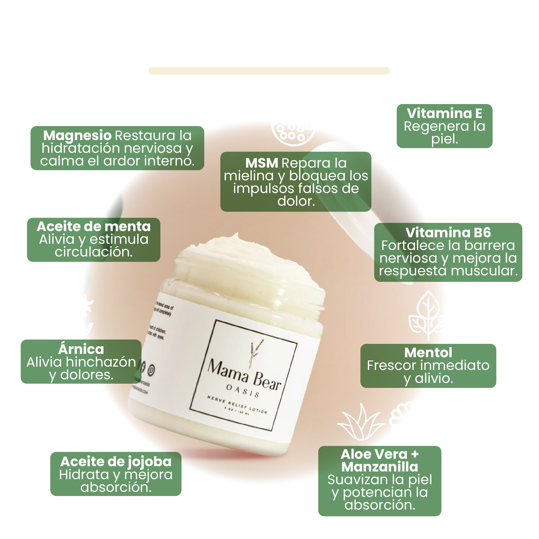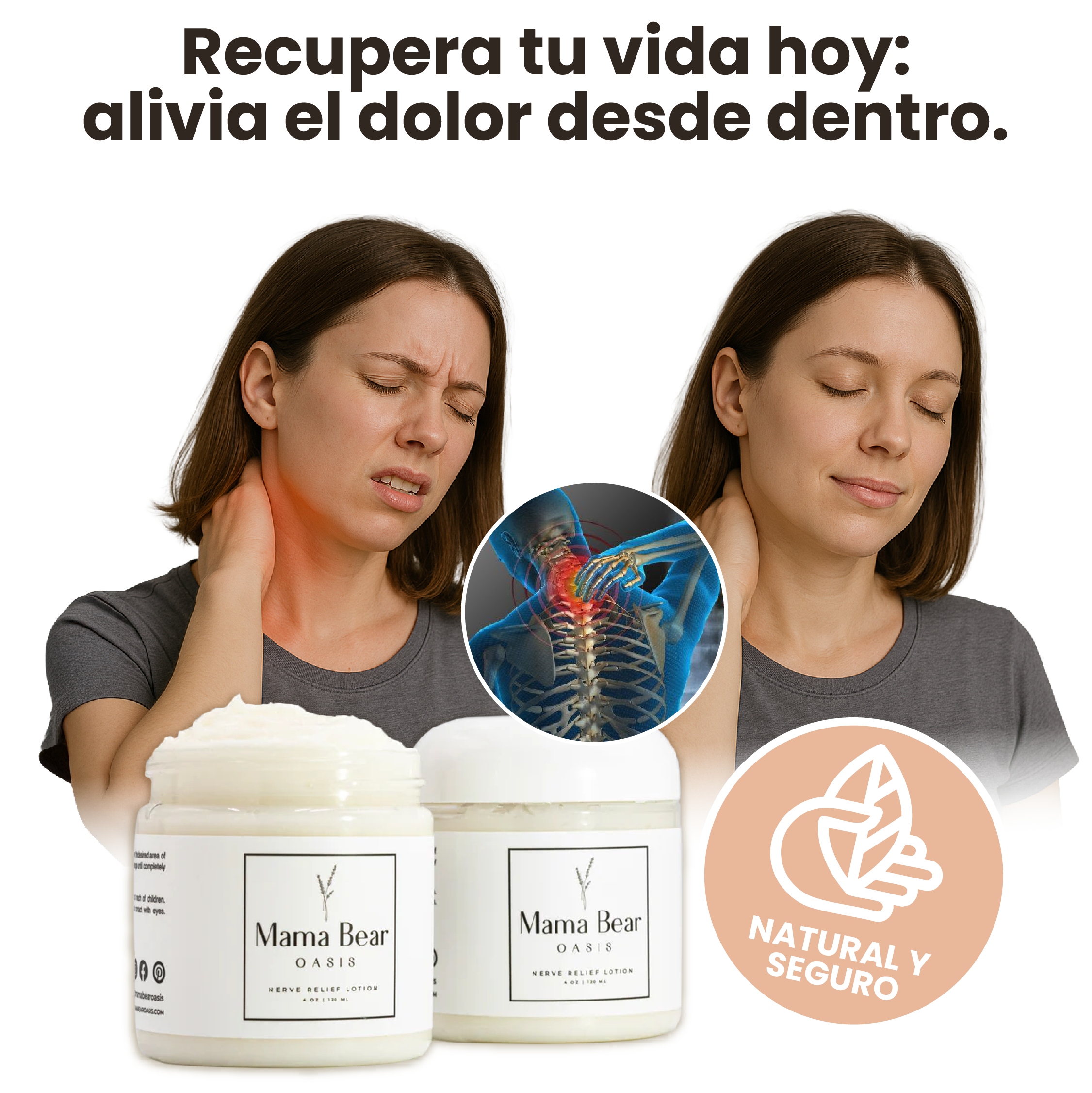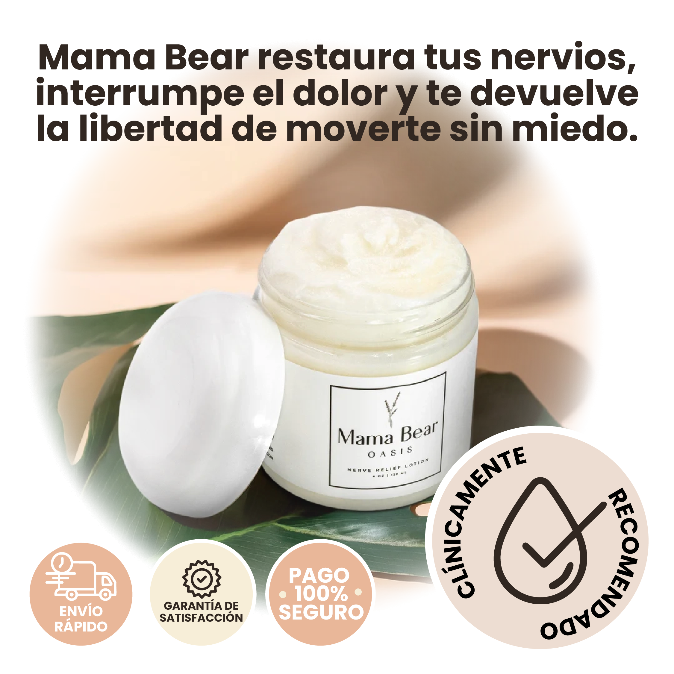 Mama Bear Nerve Relief actúa con el Método de Absorción Directa: magnesio, MSM y vitamina B6 penetran la piel y llegan directo a los nervios resecos. Así rehidratan la capa protectora (mielina) y detienen las señales falsas de dolor. Resultado: alivio rápido, ligereza y movimiento natural desde la primera aplicación.”