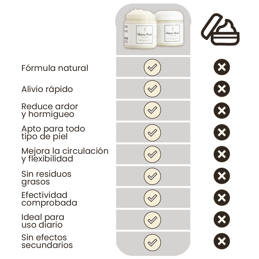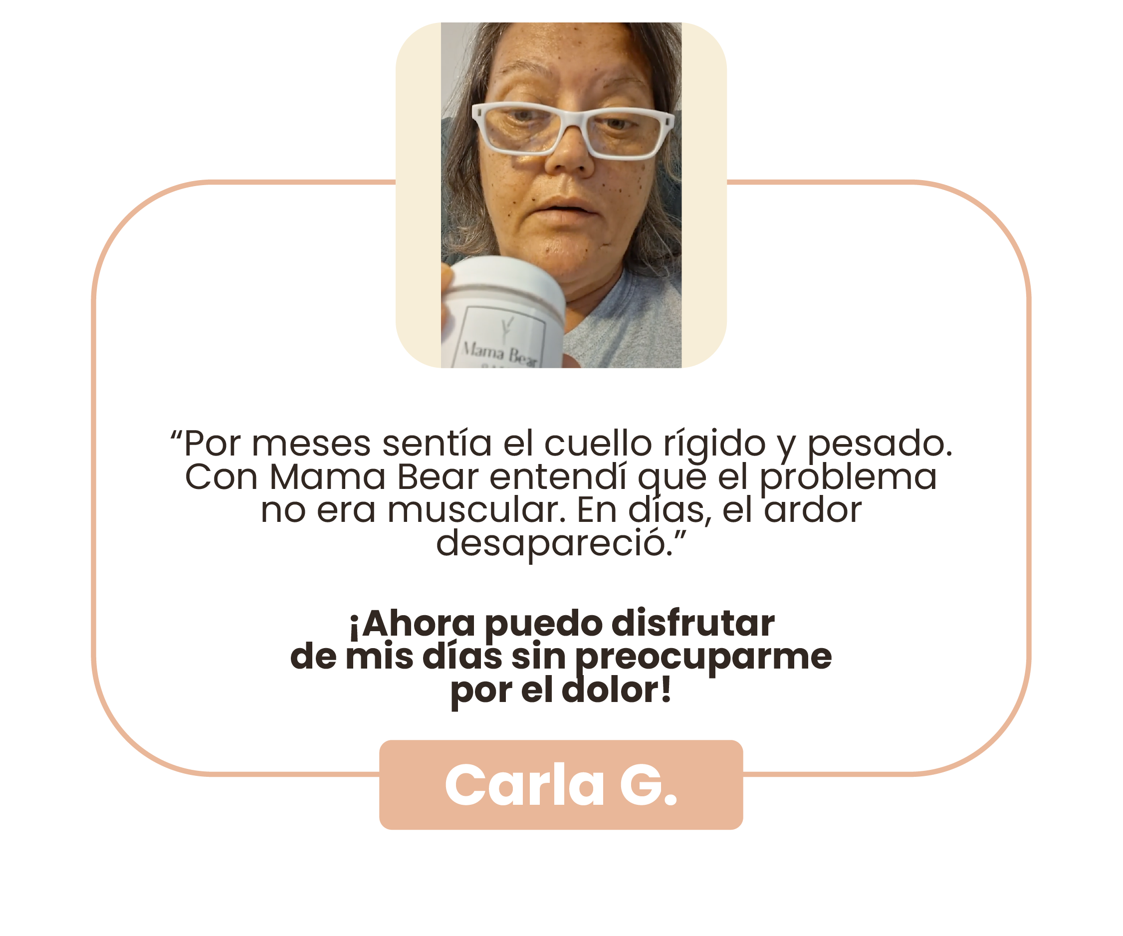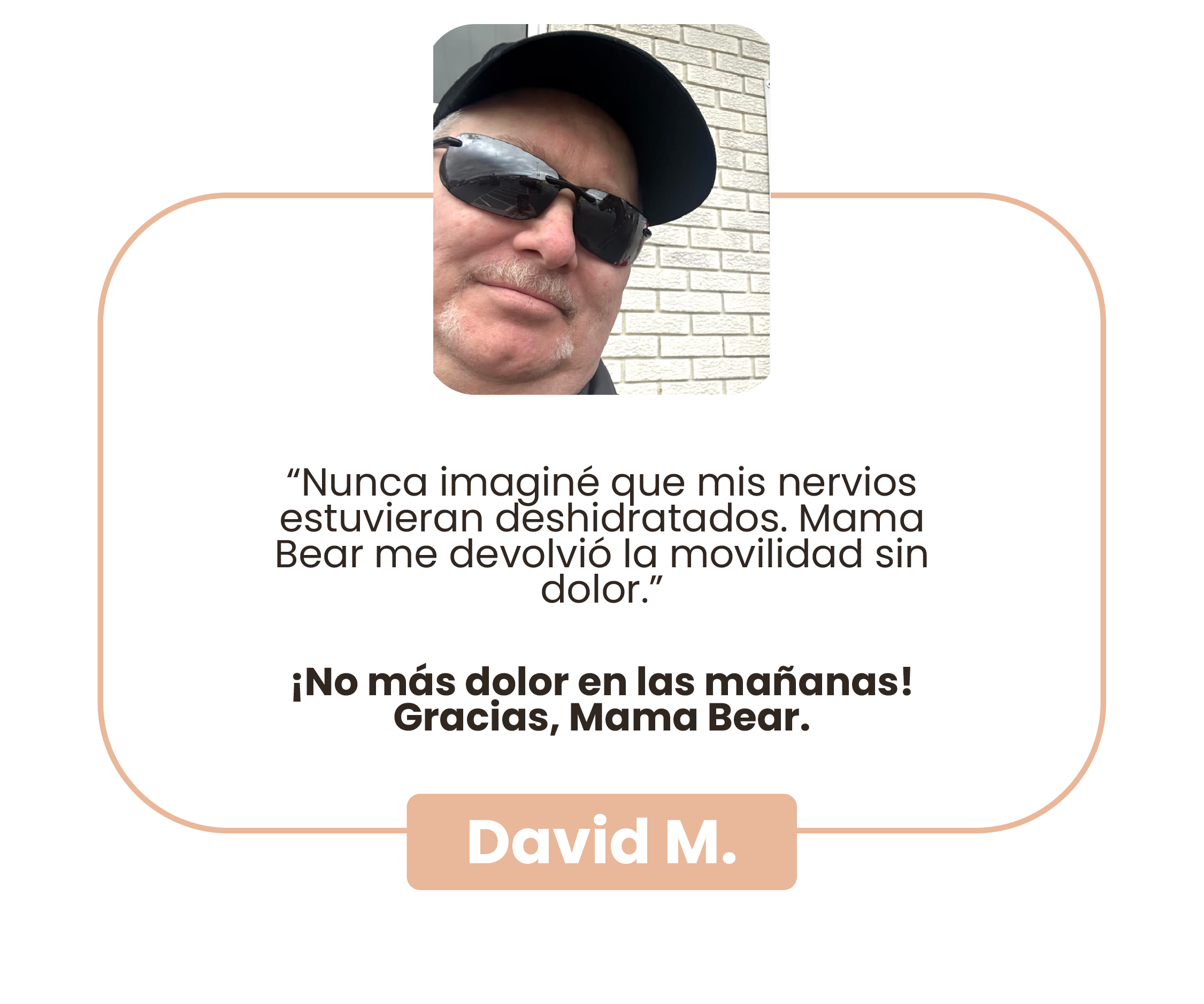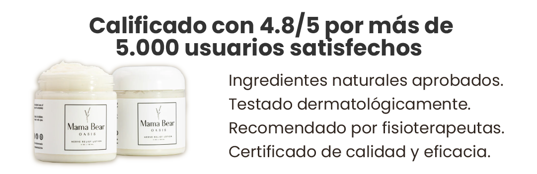 Mama Bear Nerve Relief actúa con el Método de Absorción Directa: magnesio, MSM y vitamina B6 penetran la piel y llegan directo a los nervios resecos. Así rehidratan la capa protectora (mielina) y detienen las señales falsas de dolor. Resultado: alivio rápido, ligereza y movimiento natural desde la primera aplicación.”