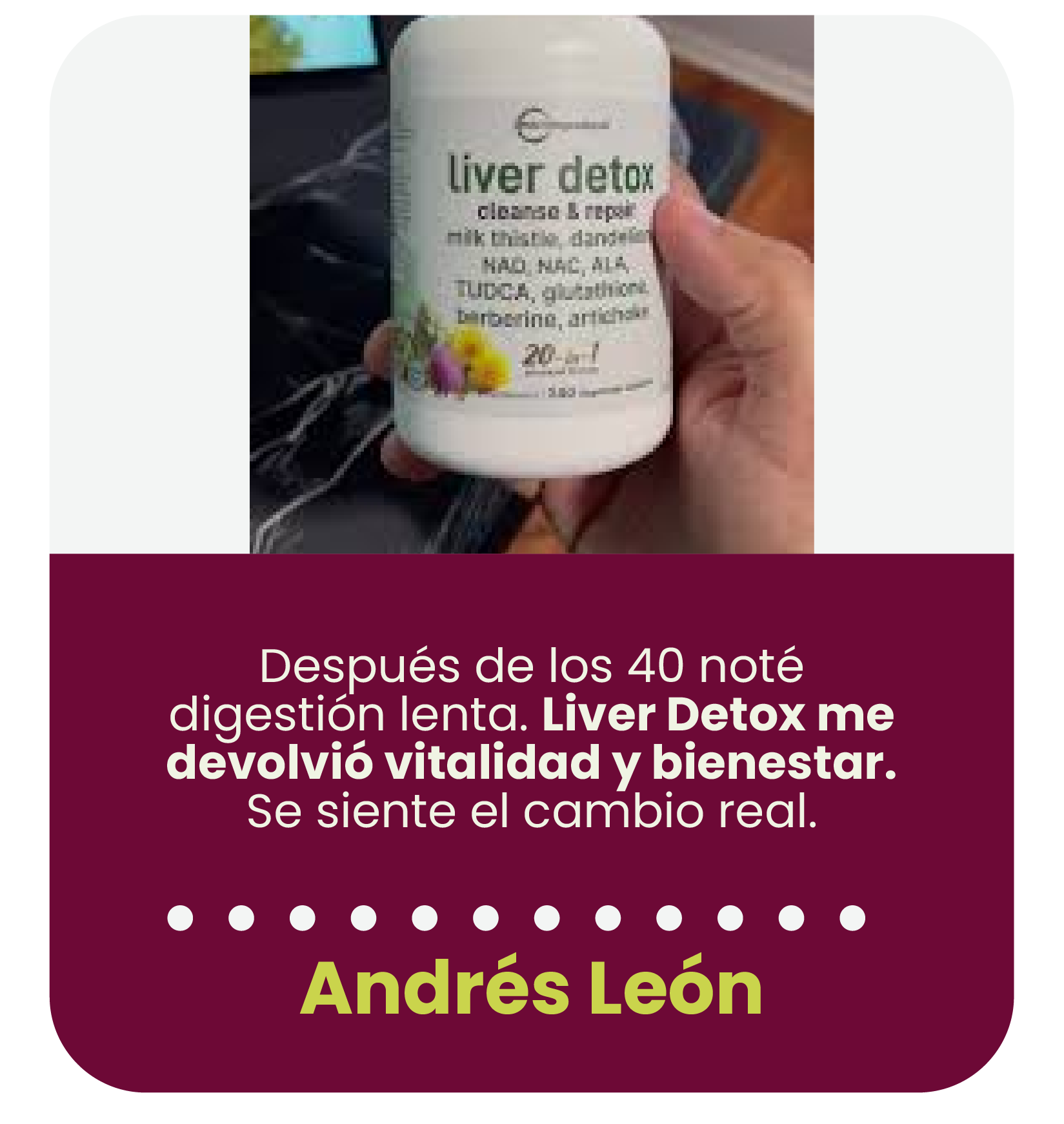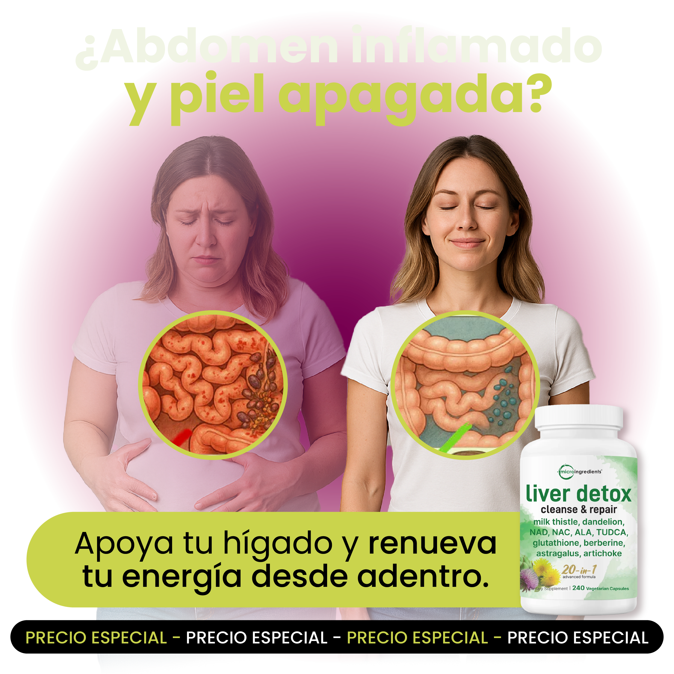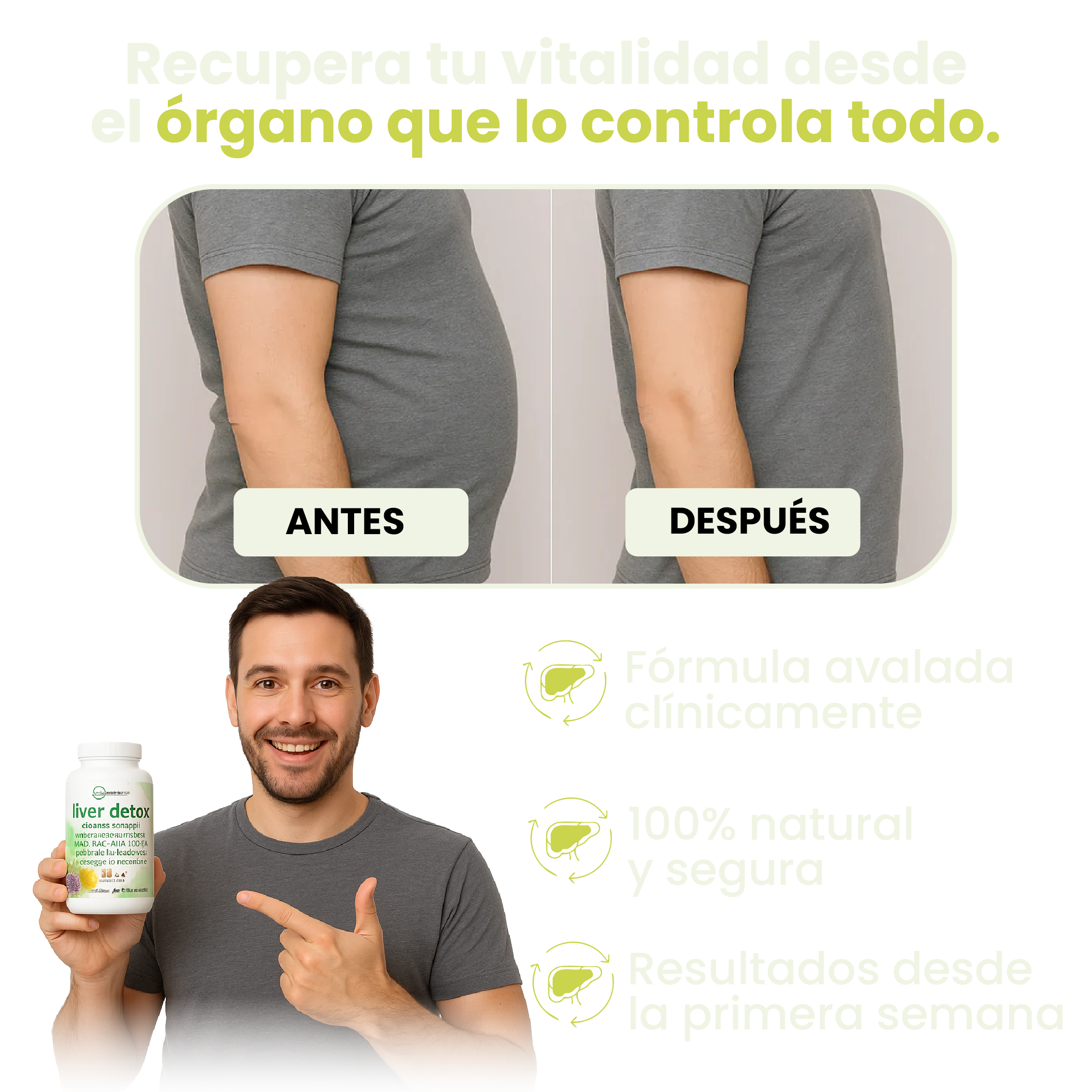 El exceso de toxinas, alcohol, medicamentos y comidas procesadas ralentiza tu metabolismo, causa fatiga y acumulación abdominal. Un hígado intoxicado dificulta la digestión y el descanso, afectando tu piel y energía.